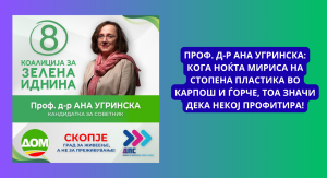 „Заокружете го бројот 8 — за здравје, достоинство и сигурност. За Коалицијата за зелена иднина“, упатува апел носителката на листата за советници во Град Скопје од Коалицијата за зелена иднина, Ана Карајанова Димитрушева.
